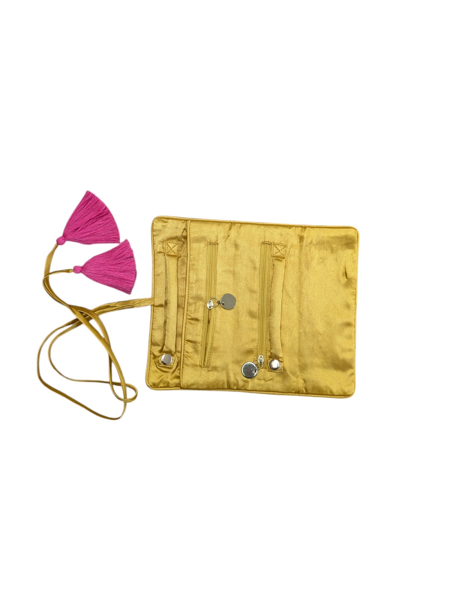 Store your jewellery elegantly and securely in this beautifully crafted jewellery roll. Rich Golden/Mustard yellow velvet is adorned with vibrant embroidered flowers and bees. finished with gold-tone piping on edges. This is with satin lining and pink tasselled ties. It's thoughtfully designed — includes open pockets, a zipped section, and padded fastened hanging bars — keep pieces neatly organised and protected.